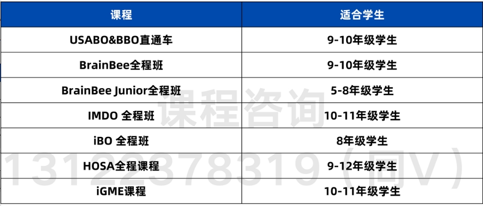 犀牛针对国际生物竞赛如BBO/USABP/Brain Bee等开设有多个班型的课程,还可以根据学生自身水平进行一对一辅导。