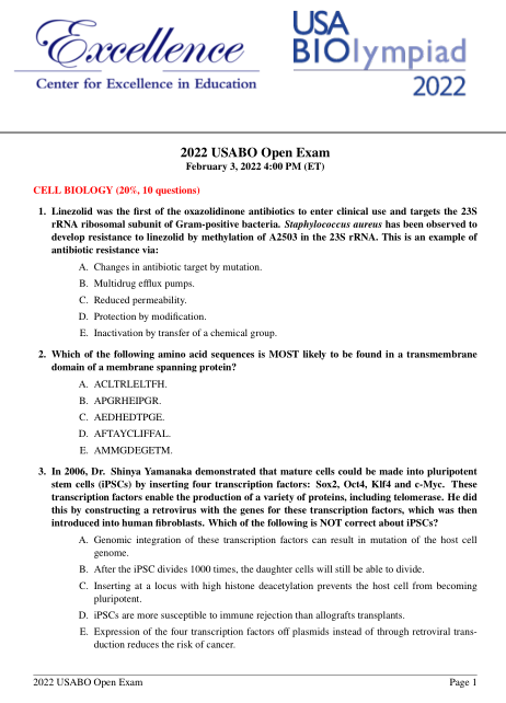 一、如何备考才能拿到双金奖? 1.梳理竞赛重点章节: 复习竞赛的核心考点和重点章节,如细胞代谢、遗传学、动物生理等,强化对知识点的记忆,并找出自己的薄弱环节; 2.进行真题模拟训练: 按照考试的时间和要求,每天进行一次真题模拟训练,提前适应考试节奏,做完后及时复盘,分析错题原因,总结解题技巧和答题规律。 3.回顾错题,查缺补漏 回顾备考过程中整理的错题本,找出自己还存在的薄弱点,进行针对性查缺补漏,条件允许可以通过网课学习或寻求专业老师帮助。 二、BBO&USABO竞赛历年真题 *篇幅有限,仅展示部分内容