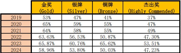 整体来看,虽然 2021 年到 2022 年分数线有较大提升,但 2023 年到 2024 年分数线又有所下降,尤其是 2024 年在总分达到历年来最高的情况下,金奖分数线远低于 2023 年。