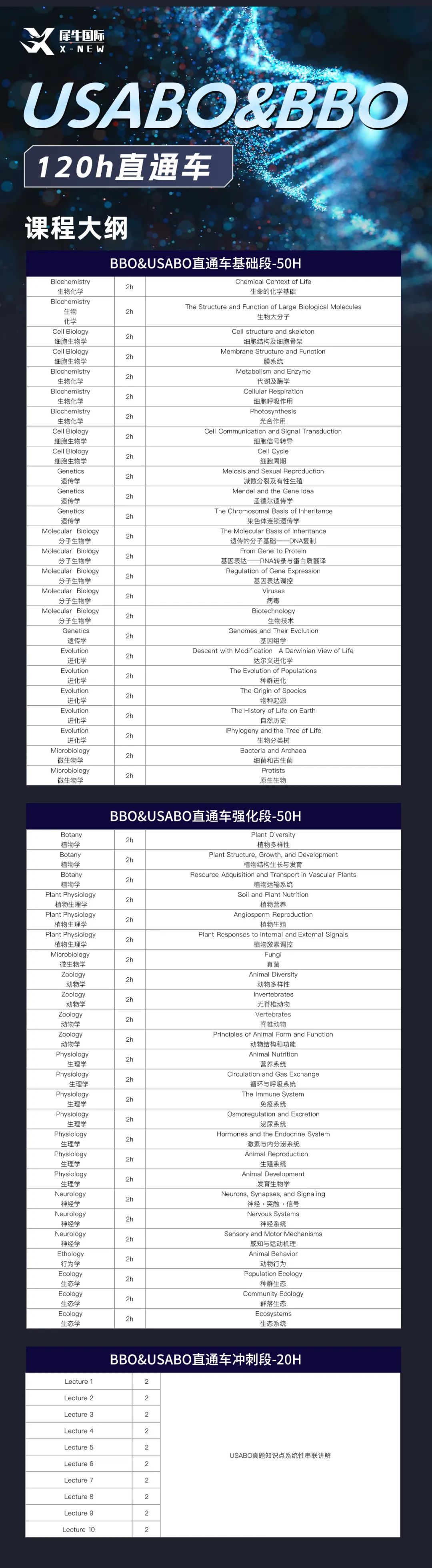 犀牛教育开设了生物竞赛直通车,涵盖BBO竞赛和USABO竞赛的所有考点,包含基础、强化、冲刺三个备考阶段,不同基础可选择不同的班级。