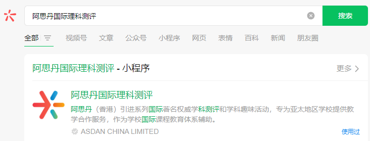 1.微信搜索“阿思丹国际理科测评”小程序