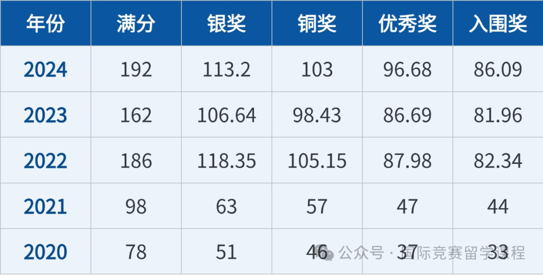 ① 2024年满分192分,金奖113.2分,银奖103.3分,铜奖96.05分;